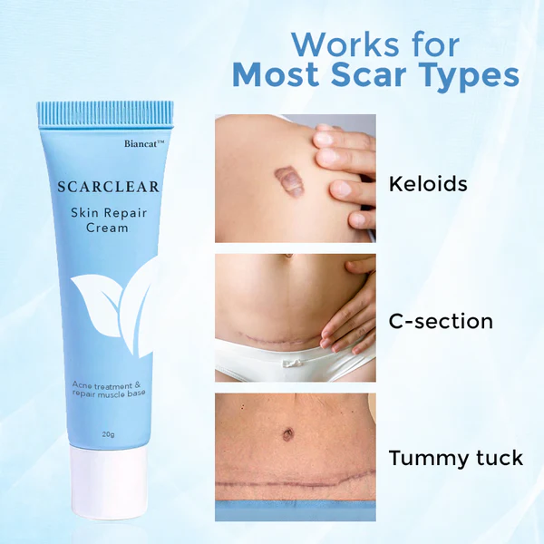 Backed by scientific expertise and dermatologist recommendations, our advanced formula is designed to transform various types of scars. Trust Biancat™ ScarClear as your ally on the path to scar-free skin. Embrace the potential of your skin and embark on a transformative journey with Biancat™ ScarClear Skin Repair Cream.