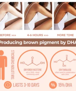 Our natural self tanner contains an active ingredient called dihydroxyacetone (DHA), which reacts with the amino acids in the top layer of the skin, producing a brown pigment known as melanoidins and giving your complexion a naturally tanned look. This dermatologist-approved ingredient is perfect for anyone trying to achieve an even, all-over tan without the sun damage. Once applied, DHA’s darkening effect develops within 3 hours. When it settles, the golden glow can last up to one week. While dihydroxyacetone (DHA) continues to darken the outer layer of skin, a blend of coconut oil, aloe vera, and caramel extract helps nourish, hydrate, and protect your skin, keeping it glowy and healthy. The DHA in our tanning lotion is also derived from plant sources like sugar canes or sugar beets, making it generally tolerable by different skin types.