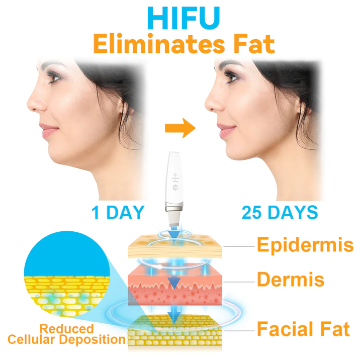 GFOUK™ HIFU Face Lifting Instrument is a non-invasive and innovative cosmetic instrument that uses HIFU technology to generate high-intensity ultrasonic energy in deep tissues to stimulate the regeneration of collagen and elastin fibers in the skin. It promotes the decomposition and metabolism of facial fat. It effectively lifts sagging skin to achieve a slimmer face and eliminate double chin.
