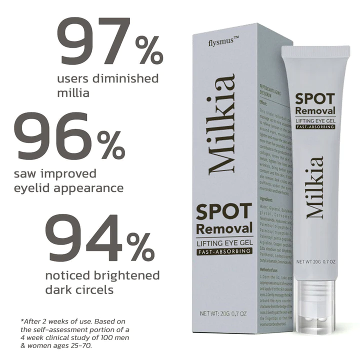 The flysmus™ Milkia Spot Removal Lifting Eye Gel is a powerful yet gentle solution designed to eliminate white spots around the eyes. Its unique formula dissolves trapped keratin, leading to smoother and firmer skin with consistent use. Say goodbye to stubborn white bumps and hello to a refreshed, youthful look with this innovative eye gel.