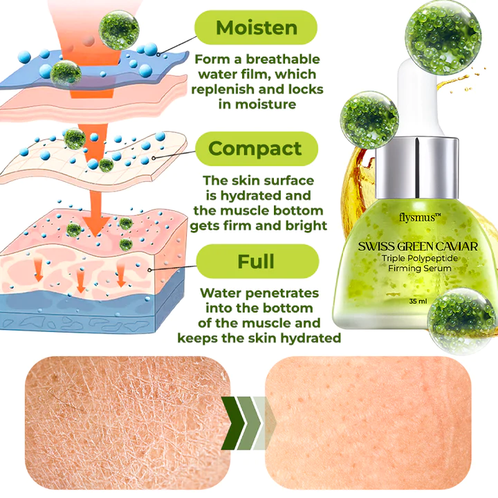 Using the flysmus™ Swiss Green Caviar Triple Polypeptide Firming Serum on the skin stimulates the production of new collagen proteins, leading to a more voluminous and firmer skin appearance. Additionally, the serum speeds up the turnover of skin cells, encouraging the generation of fresh cells in the outermost layer of the skin. This process has the potential to diminish the appearance of fine lines, wrinkles, and sagging.