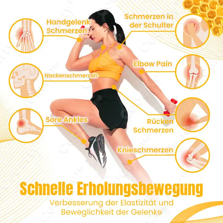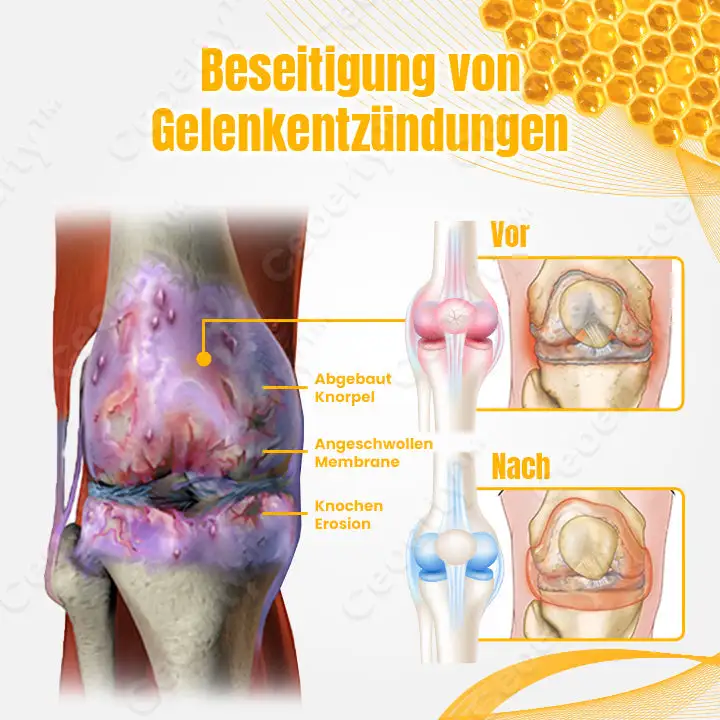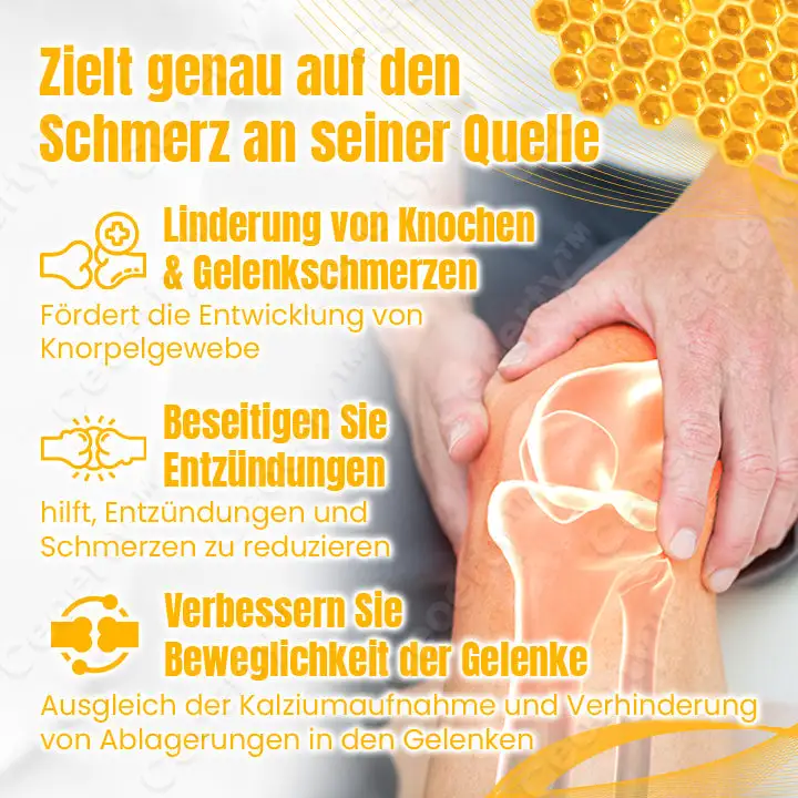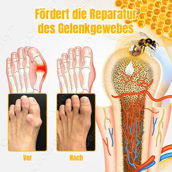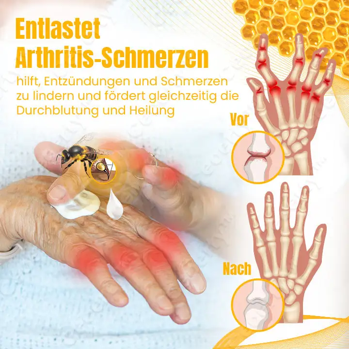 Ceoerty™ BuzzCure Creme ist renommiert für ihre Effektivität bei der Behandlung einer Vielzahl orthopädischer Beschwerden wie Arthrose, rheumatoide Arthritis, Schleimbeutelentzündung, Tendinitis, Osteoporose, Gicht, Karpaltunnelsyndrom, Bänderverstauchungen und -zerrungen, Ballenverformungen sowie Tennisellenbogen. Die Creme verwendet eine fortschrittliche transdermale Technologie, die es den wirkaktiven Inhaltsstoffen ermöglicht, die Hautbarriere effizient zu durchdringen und das darunterliegende Gewebe zu erreichen. Beim Auftragen auf die Haut interagiert das Bienengift mit Rezeptoren, die an der Schmerzwahrnehmung und Entzündung beteiligt sind. Diese Wechselwirkung kann zu einer Modulation der Entzündungswege führen, wodurch die Freisetzung entzündungsfördernder Moleküle, die zu Gelenk- und Knochenschwellungen beitragen, reduziert wird. Zudem fördert es die Regeneration von geschädigten Zellen und Geweben, wodurch der Heilungsprozess unterstützt wird. Unsere Kunden berichten von einer signifikanten Schmerzlinderung und verbesserten Beweglichkeit nach regelmäßiger Anwendung.