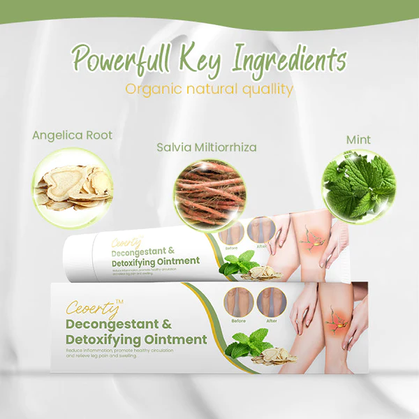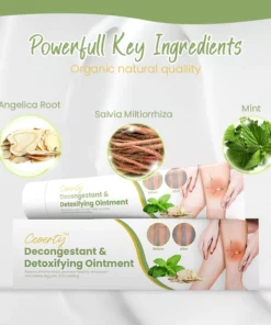The ointment is primarily used to relieve swelling and pain in the legs; it also contains natural ingredients that support the body’s natural detoxification process: Ceoerty™ Decongestant & Detoxifying Ointment helps flush toxins from the body and relieve stress and fatigue. It balances and improves health through cleansing. With this simple ointment, you will be able to restore your health and energy levels so you can finally get back to living your life!