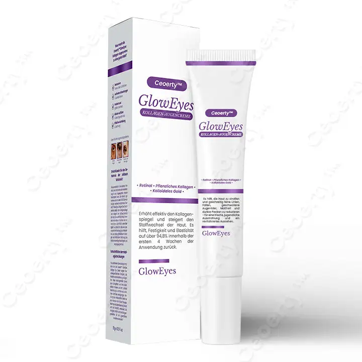 Wissenschaftlich formuliertes Produkt, das die Zeichen der Hautalterung in der Augenpartie wirksam bekämpfen kann. Die klinisch getestete und von über 10.000 Dermatologen weltweit empfohlene Ceoerty™ GlowEyes Kollagen-Augencreme erhöht effektiv den Kollagenspiegel und steigert die Stoffwechselrate der Haut. Sie verhilft der Haut innerhalb der ersten 4 Wochen der Anwendung zu über 94,8 % mehr Festigkeit und Elastizität. Mit einer synergetischen Mischung aus Wirkstoffen wie Retinol, pflanzlichem Kollagen und kolloidalem Gold sorgt sie für die notwendige Feuchtigkeit und Verjüngung der Haut.