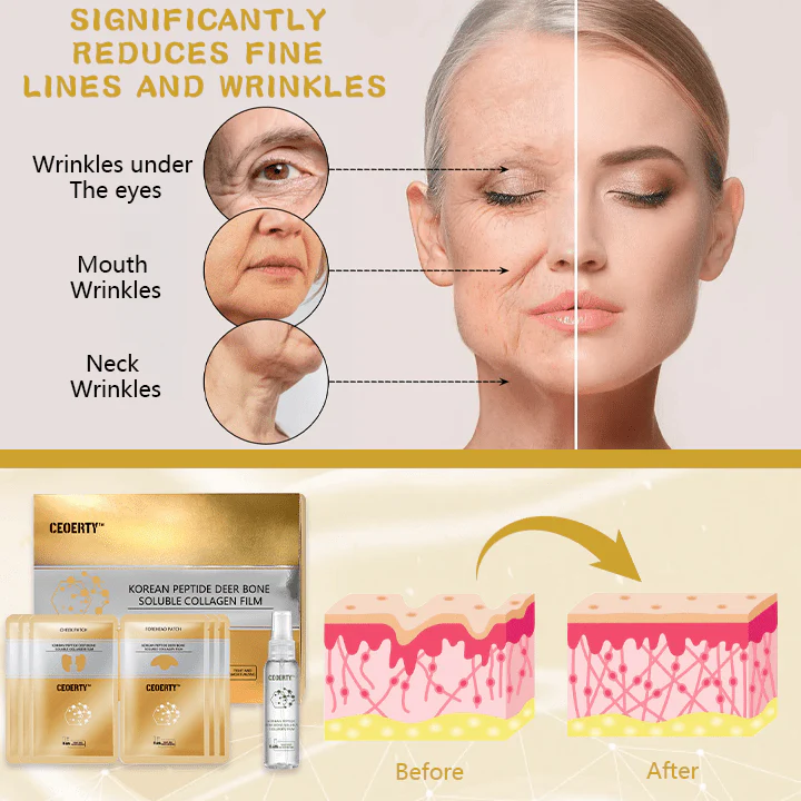 As we age, fine lines and wrinkles begin to appear, and our skin becomes dry, saggy, and dull. These are the frustrating signs of aging that many of us face. Ceoerty™ Korean Peptide Deer Bone Soluble Collagen Film offers a comprehensive solution, helping you regain your youthful glow.