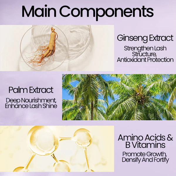 Ginseng Extract: Rich in antioxidants, minerals, and B vitamins, it aids in strengthening and maintaining the natural structure of the eyelashes, fortifies the stability of the follicles, supplies the essential nutrition, and reduces the risk of damage.