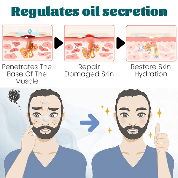Men’s AcneFree Hydra Cream is meticulously designed with antibacterial and anti-inflammatory properties. Its antibacterial components penetrate deep into the pores, eliminating bacteria hidden beneath the skin’s surface, effectively addressing the root causes of acne. Unlike standard skincare products, it not only cleanses the skin but also provides an antibacterial barrier that protects your skin from bacterial invasion for extended periods. Meanwhile, the anti-inflammatory ingredients swiftly alleviate skin inflammation, reduce redness, and offer immediate soothing effects.