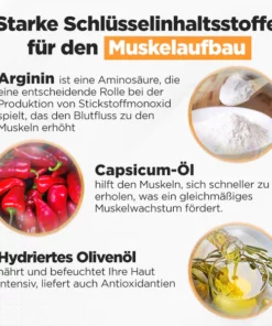 Capsicumöl ist gut für den Körperbau und das Muskelwachstum. Es lindert Entzündungen, hilft bei der Muskelerholung und reduziert Schmerzen nach dem Training. Das macht es einfacher, die Muskelmasse zu vergrößern, ohne den Körper zu sehr zu belasten. Die natürlich entspannende und entzündungshemmende Wirkung von Capsicum-Öl hilft den Muskeln, sich schneller zu erholen, und fördert so ein gleichmäßiges Muskelwachstum.