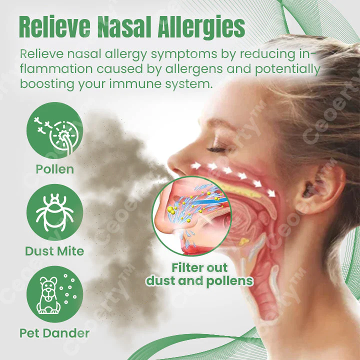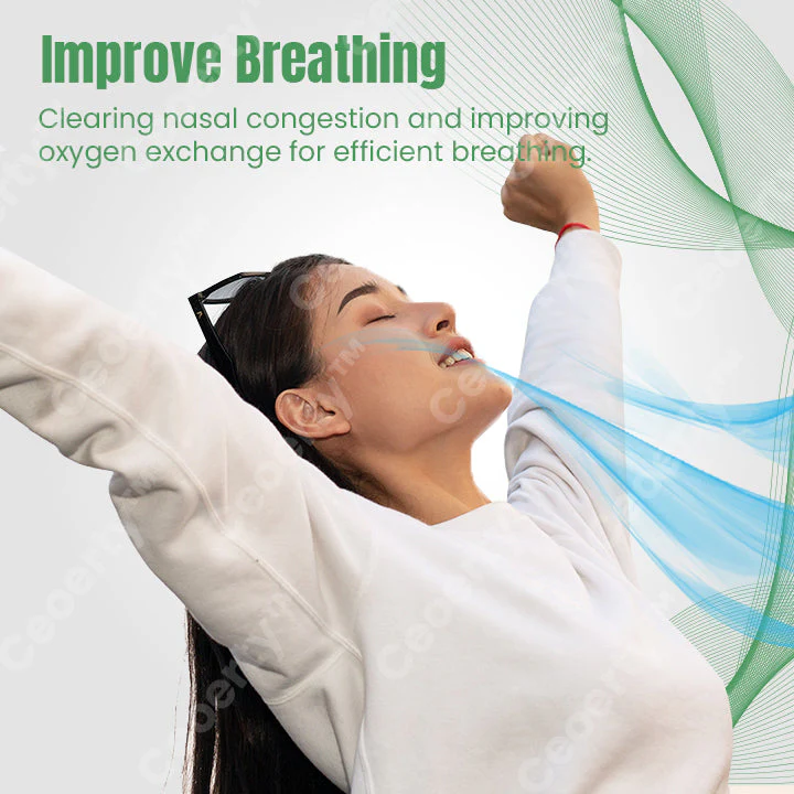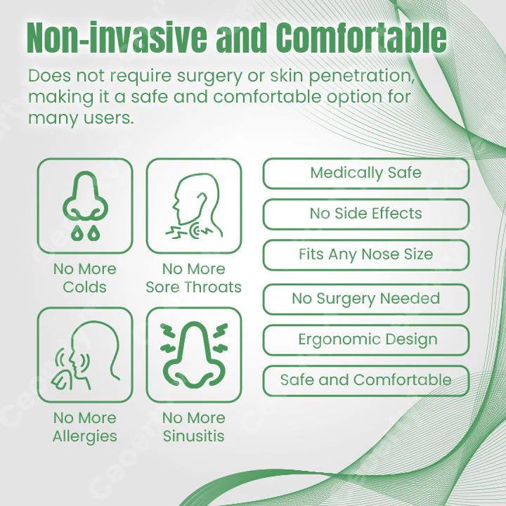 A groundbreaking, non-invasive and drug-free solution to nasal congestion and breathing problems! Ceoerty™ NasalClear device aims to gently and effectively target the core of nasal congestion, providing long-lasting relief without the need for daily medication or disposable products. With its advanced technology, it stimulates the natural drainage of your sinuses, resulting in clearer and more comfortable breathing.