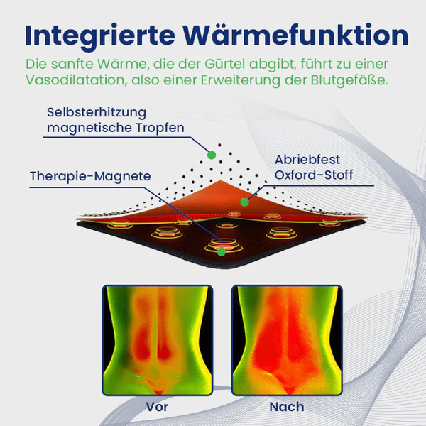 Der Ceoerty™ NierenGuard Akupressur-Therapie-Gürtel hilft den Nieren, indem er Magnettherapie und Akupressur kombiniert, um bestimmte Punkte zu stimulieren, die mit den Nieren in Verbindung stehen. Diese Stimulation fördert den Blut- und Energiefluss zu den Nieren und hilft so, Nierensteine aufzulösen und die Nierenfunktion zu verbessern. Unser Akupressur-Therapiegürtel verfügt auch über eine integrierte Wärmefunktion. Die sanfte Wärme, die der Gürtel abgibt, fördert die Vasodilatation – die Erweiterung der Blutgefäße. Dieser Mechanismus verbessert die Blutzirkulation und stellt sicher, dass lebenswichtige Nährstoffe die Nieren erreichen, während er gleichzeitig den Abtransport von Abfallprodukten unterstützt.