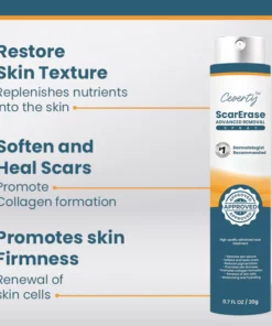 Ceoerty™ ScarErase Advanced Removal Spray is specifically designed to promote skin health, firmness and elasticity and reduce the appearance of most types of scars, including surgical scars, burn scars, hypertrophic scars and keloids. The silicone-based scar gel forms a breathable layer that increases skin hydration, protects scar tissue, normalizes collagen synthesis and balances the skin growth process, leaving your skin looking smooth and even! It is guaranteed to remove new scars in as little as 4 weeks and old scars in 4-8 weeks!