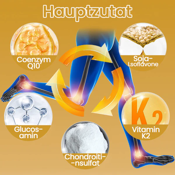 Coenzym Q10: Coenzym Q10 ist eine antioxidative Substanz, die die Energieproduktion in den Zellen fördert. Es unterstützt die Reparatur und Regeneration von Gewebe und trägt zur Erhaltung der Gesundheit von geschädigten Gelenken und Knochen bei.