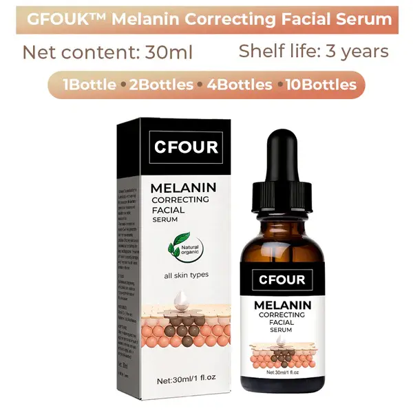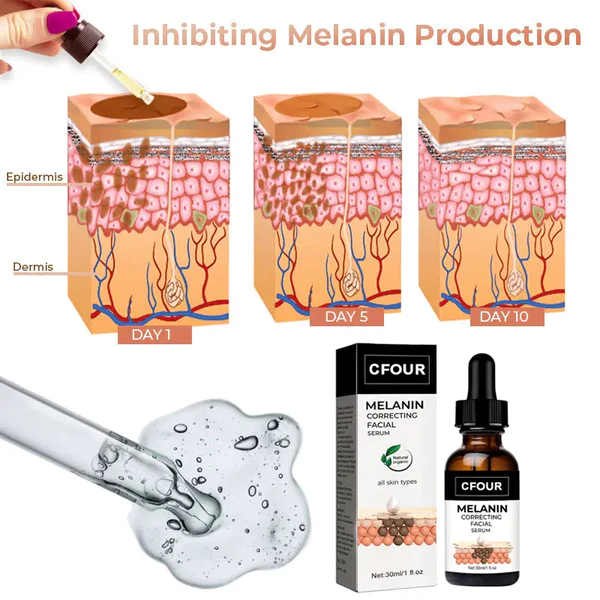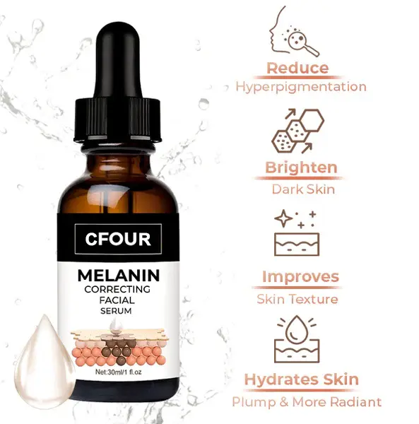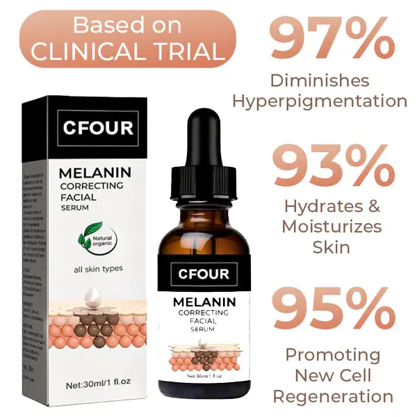 CFOUR™ Melanin Correcting Facial Serum contain active ingredients that help to lighten hyperpigmentation by reducing the production of melanin in the skin, breaking up existing melanin clusters, and promoting the growth of new, healthy skin cells.