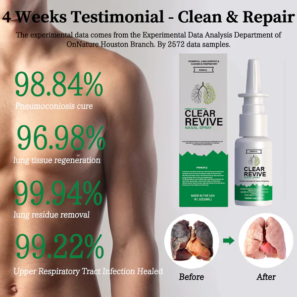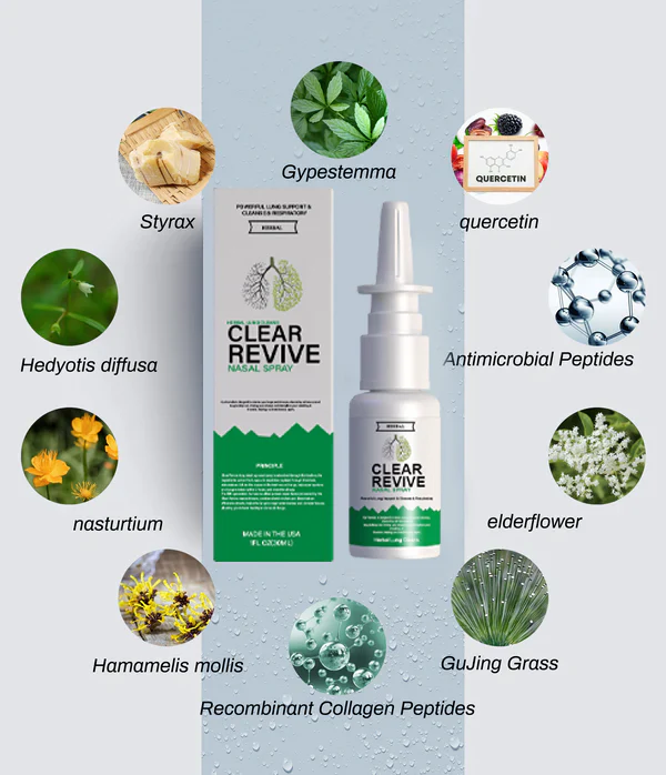 Clear Revive® lung clearing nasal spray is absorbed through the trachea, the ingredients act on the lungs and respiratory system through the blood, stimulate and dilute the mucus in the trachea and lungs, help expel sputum and lung residues within 2 hours, and clear the airway. It can also help correct your immune system, reduce allergic reactions through desensitization therapy, and effectively treat diseases such as respiratory allergies/asthma. The fifth-generation human-modified protein repair factor created by the Clear Revive research team, combined with extracts of mullein and Dendrobium candidum, helps the regeneration of lung trachea and alveolar tissue, giving you a healthy and smooth lung.