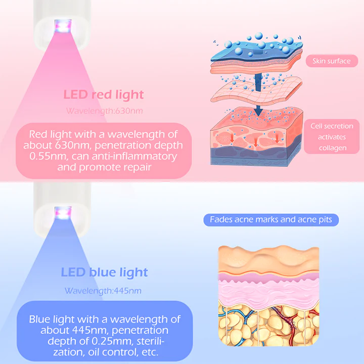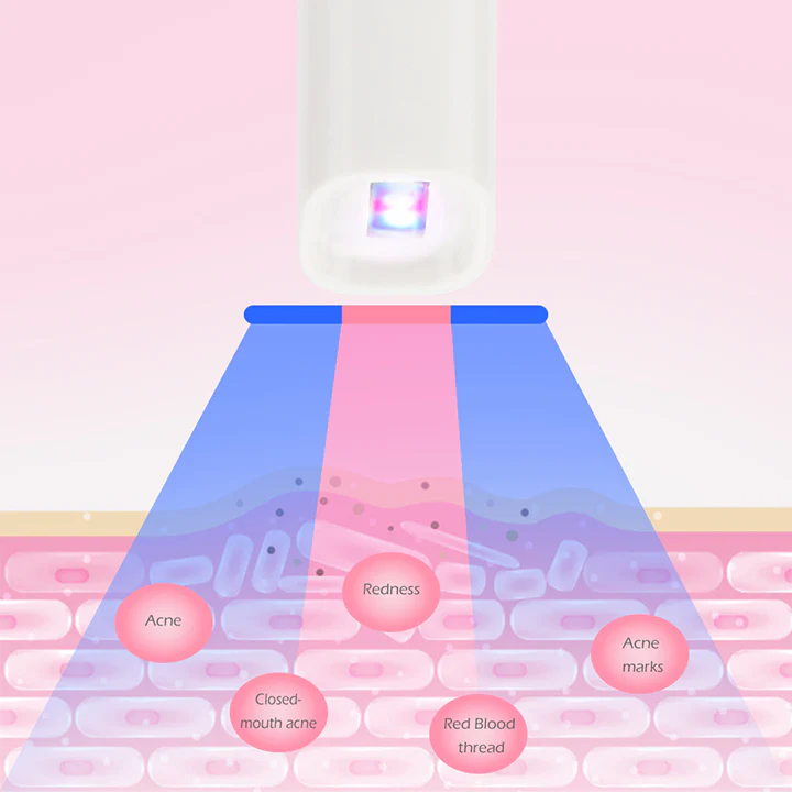 This handy and portable acne removal tool features a small, luminous mouth shot that emits blue and red LED lights at the same time.