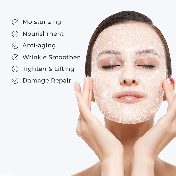 This Water Activated Collagen Lace Mask is made of lace pattern with special technology. Soaking the mask paper in water will turn freeze-dried ingredients into a rich, liquid essence that deeply moisturizes and nourishes skin.