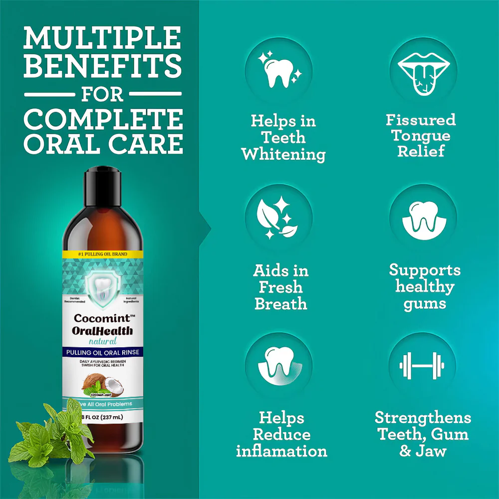 Cocomint™ Oral Health Pulling Oil is the leading oil-pulling brand in the USA, endorsed by dentists and certified by the American Dental Association. Our unique blend of essential oils, effectively addresses a wide range of oral issues, including dental calculus, bad breath, oral ulcers, dental caries, bleeding gums, tooth sensitivity, gingivitis, loose teeth, periodontitis, swollen gums, tooth damage, and tooth loss. With no side effects and made from 100% natural herbs, our products are suitable for everyone, from children to the elderly, ensuring comprehensive oral health.