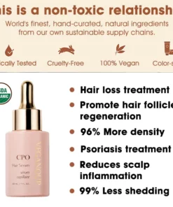 “CPO™ Serum is an incredibly powerful yet affordable solution that harnesses the power of premium ingredients to boost blood circulation to the hair follicles, fight hair diseases, improve hair softness and antioxidant capacity, and relieve the symptoms of scalp inflammation. It comprehensively solves the problems of hair loss, thinning hair, alopecia areata, scalp psoriasis, fungal infection, itchy scalp or damaged hair, and is safe to use, having been FDA certified with no allergic reactions or side effects. Plus, it provides the essential nutrients needed for hair growth and a healthy scalp, making CPO an excellent maintenance and treatment solution!“