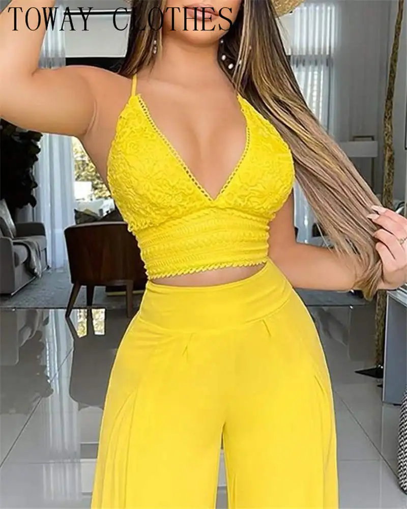 Crochet Lace Halter Crop Top & Wide Leg Pants Set
