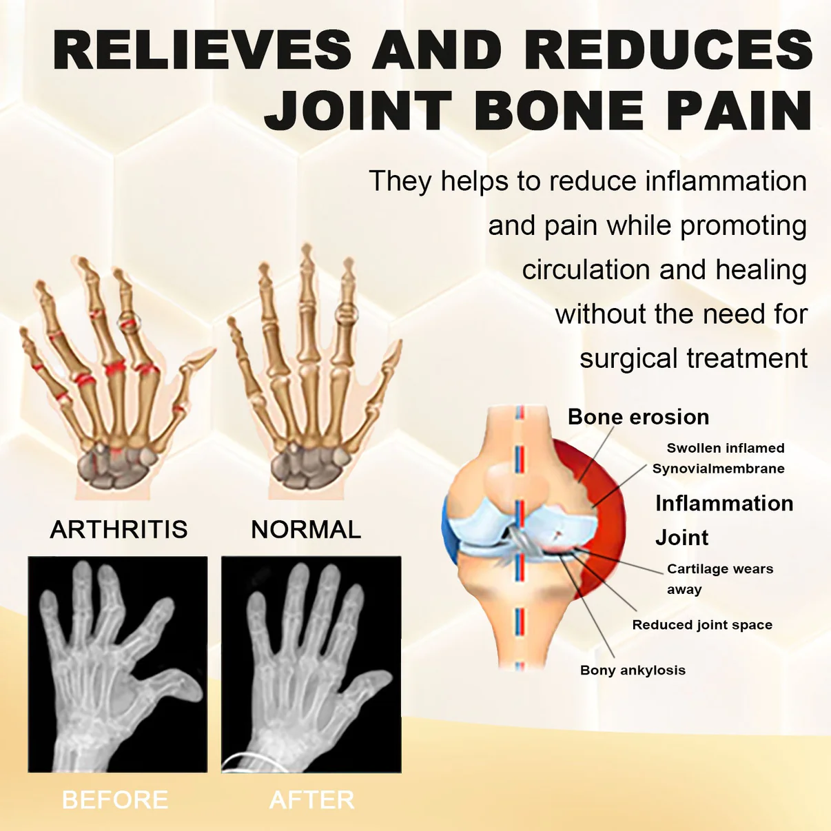 - Melittin in bee venom has a strong anti-inflammatory effect, which can reduce the inflammatory response of arthritis, thereby reducing joint pain and swelling, and improving joint mobility