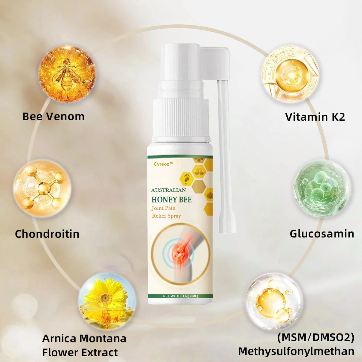 Cvreoz™ Bee Venom Pain and Bone Healing Spray contains six powerful and proven ingredients that have been used to effectively treat arthritis and bone-related diseases in millions of people around the world.