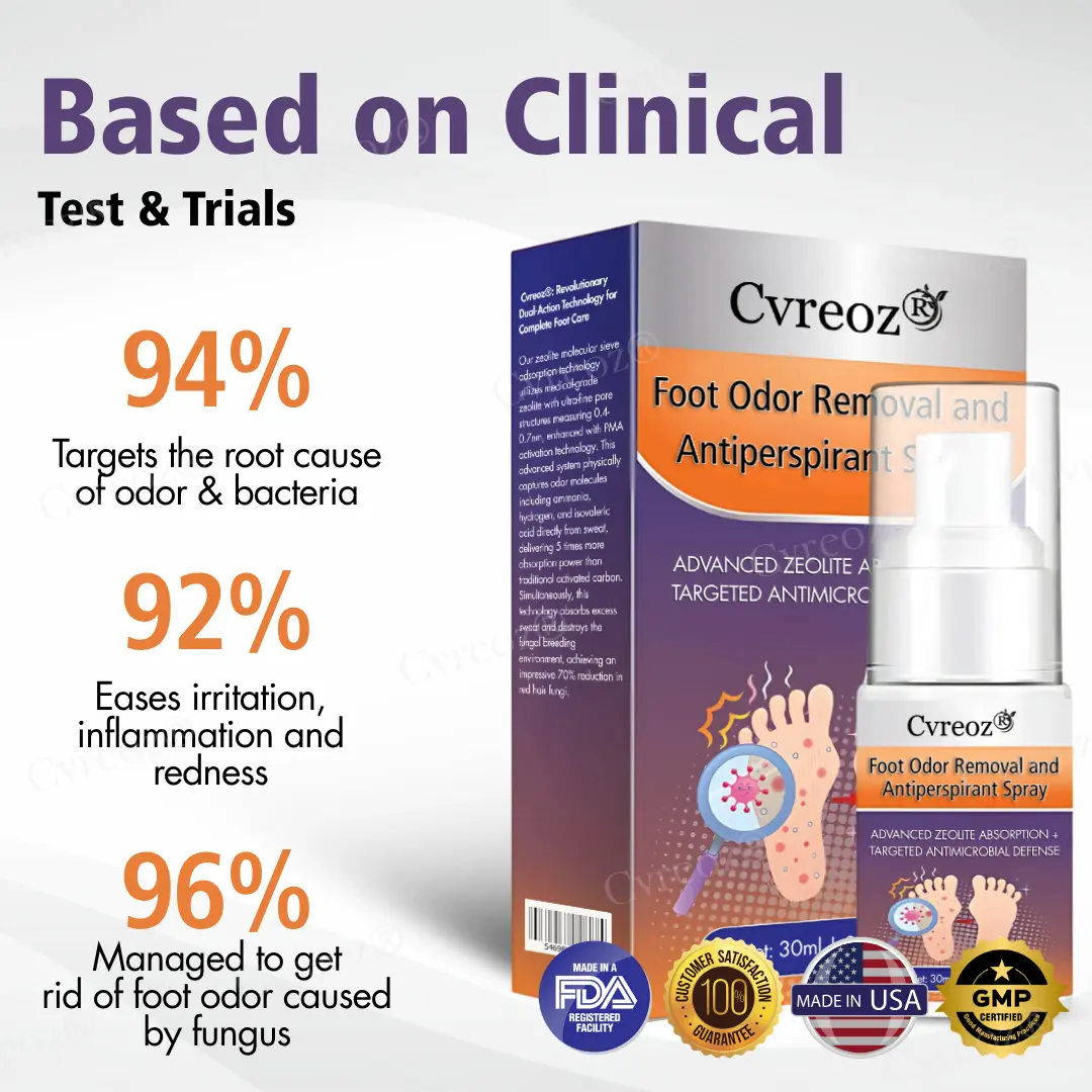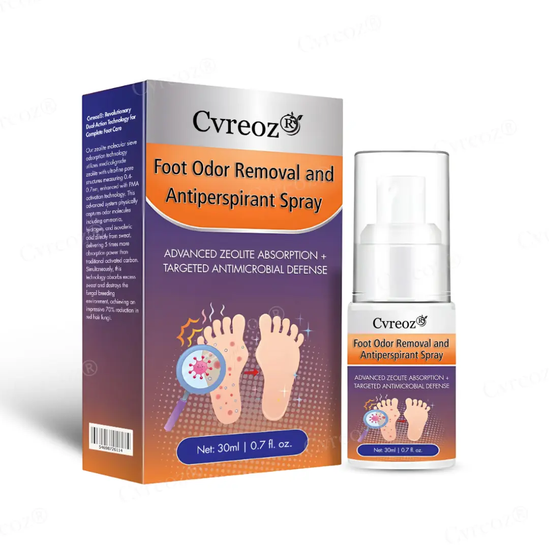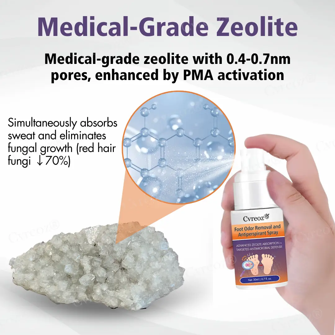 Cvreoz® represents a breakthrough in foot care technology, combining medical-grade zeolite with precision-engineered 0.4-0.7nm pores and advanced PMA activation technology. This innovative formulation creates a multi-layered defense system that simultaneously targets the root causes of foot odor: fungal infections, bacterial overgrowth, and excessive moisture. Unlike conventional treatments that only address surface symptoms, Cvreoz® penetrates deep into the skin’s microstructure to eliminate odor-causing organisms while providing long-lasting antiperspirant protection that breaks the destructive moisture-bacteria-fungal cycle.