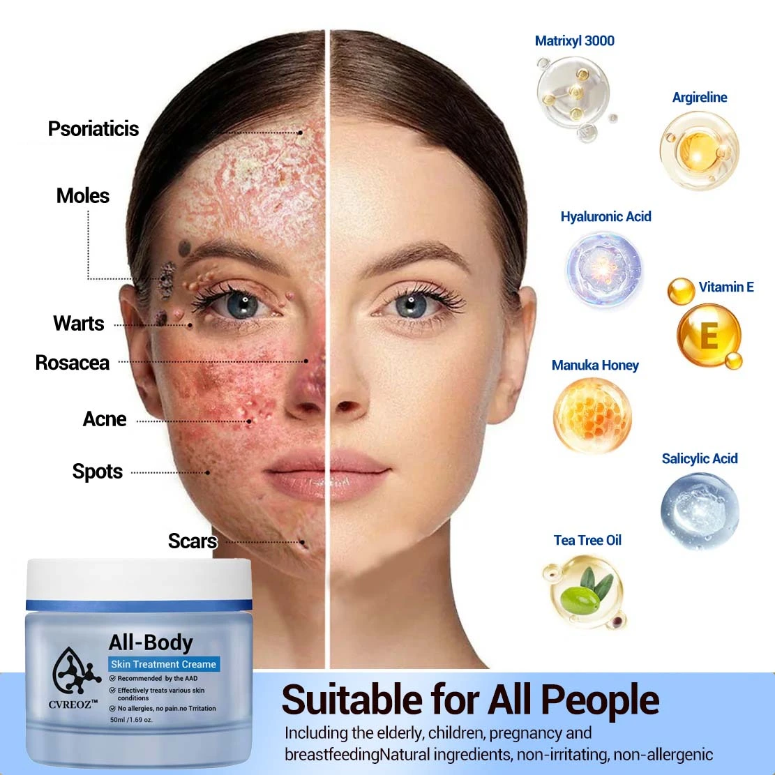 Our luxurious cream combines salicylic acid, manuka honey, and hyaluronic acid, effortlessly penetrating just below the skin’s surface to lock in moisture and boost collagen production while revitalizing skin cells. Experience the magic as it helps fade scars and imperfections, repairing skin damage from pregnancy, surgery, injuries, acne, C-sections, and signs of aging. Scientifically formulated to soften and soothe dry, itchy skin and sensitive skin types—including eczema, psoriasis, dermatitis, and rosacea—this cream brings you relief and comfort. Transform your skin and restore your confidence with every use!
