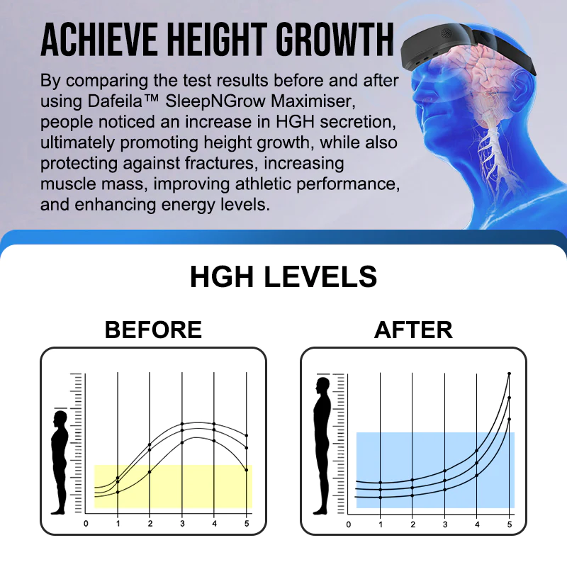 Dafeila™ Sleep Grow Maximizer employs state-of-the-art neurostimulation technology, utilizing precise and controlled electrical pulses to effectively target the affected areas of the pituitary gland. Through the use of low-intensity pulses (below 1 milliampere, with frequencies ranging from 1 hertz to several tens of hertz), it harmoniously interacts with your neural pathways, gently re-stimulating the pituitary gland to produce growth hormone. This process aims to restore growth hormone levels to the peak levels experienced during adolescence.