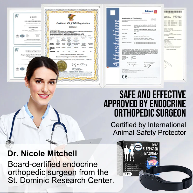 Renowned growth physiology expert and researcher at the Texas Institute of Human Health, Dr. Agatha Miller, describes Dafeila™ Sleep Grow Maximiser as an advanced therapy that delicately stimulates targeted areas of the growth system. This stimulation helps regulate neural activity, ultimately prompting the secretion of growth hormone in the brain. Supported by extensive research in the fields of sleep science and growth physiology, Dr. Miller’s endorsement further strengthens Dafeila™ Sleep Grow Maximiser innovation and potential as a solution for height development.
