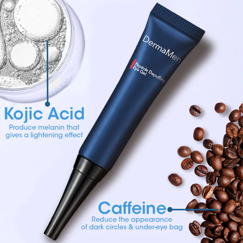 DermaMen Peptide Depuffing Eye Gel is primarily targeting visible skin concerns around the eye contour. This formula contains a high concentration of caffeine alongside Kojic Acid. This combination of active ingredients works in synergy to reduce the appearance of visible dark circles and puffiness around the contour.
