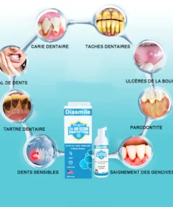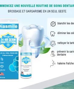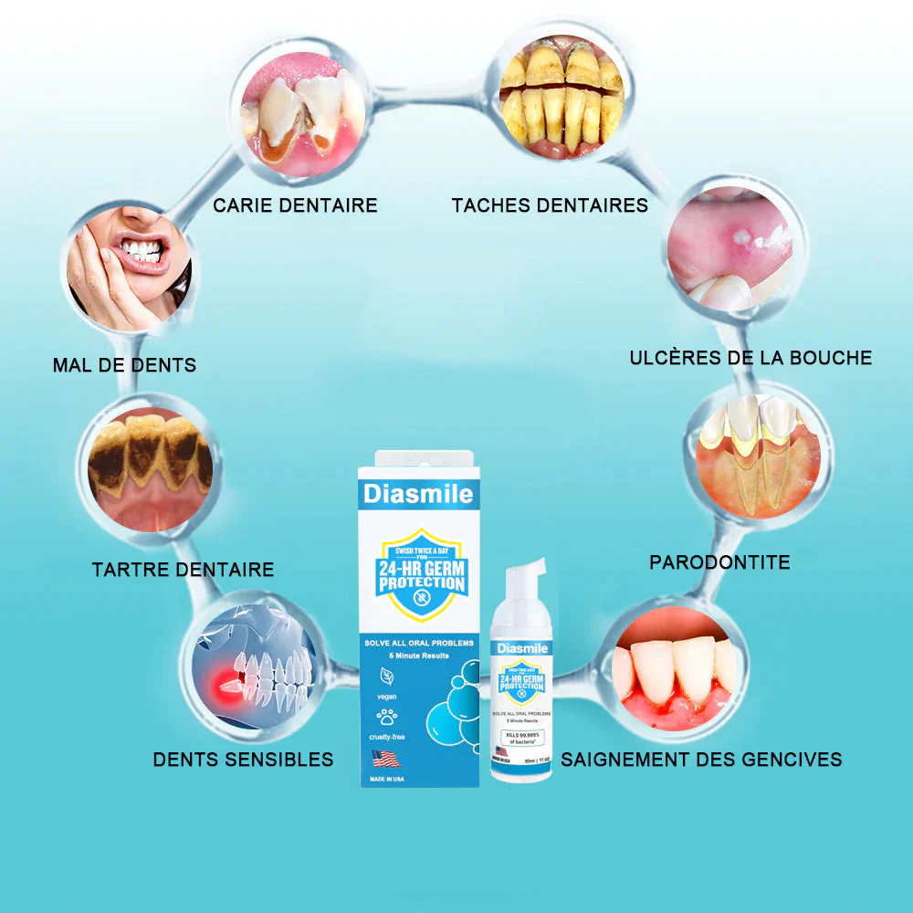 Diasimle™ est le tout dernier produit certifié par l’Association dentaire américaine et recommandé par les dentistes. Il résout parfaitement tous les problèmes bucco-dentaires, notamment le tartre dentaire, la mauvaise haleine, les ulcères de la bouche, les caries dentaires, les saignements des gencives, la sensibilité dentaire, la gingivite, les dents desserrées, la parodontite, l’enflure des gencives, les dommages dentaires, la perte de dents, etc., sans aucun effet secondaire. Fabriqué à partir de 100% d’herbes naturelles. Convient à tout le monde, y compris aux enfants, aux jeunes et aux personnes âgées.