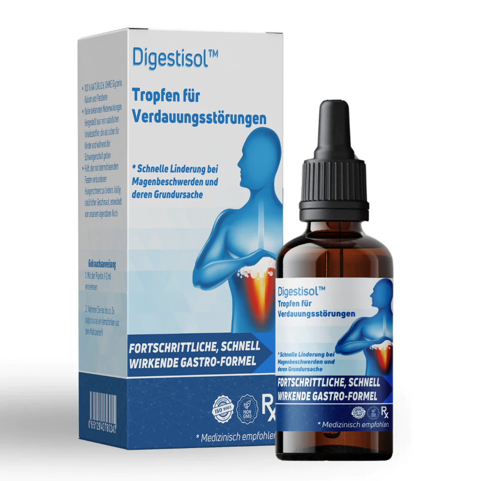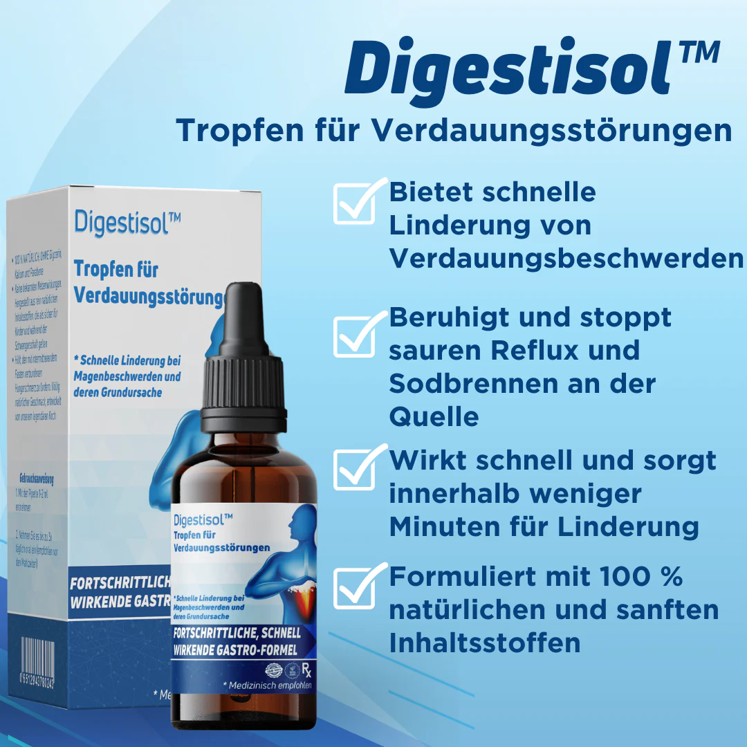 Digestisol™ Tropfen für Verdauungsstörungen wirken, indem sie auf die Ursachen von Verdauungsstörungen abzielen, vor allem auf übermäßige Magensäureproduktion und Reizungen der Magen-Darm-Schleimhaut. Die Wirkstoffe in Digestisol™ wirken zusammen, um überschüssige Magensäure zu neutralisieren. Auf diese Weise lindern sie Symptome wie Sodbrennen, saure Verdauungsstörungen, Blähungen und Unwohlsein.
