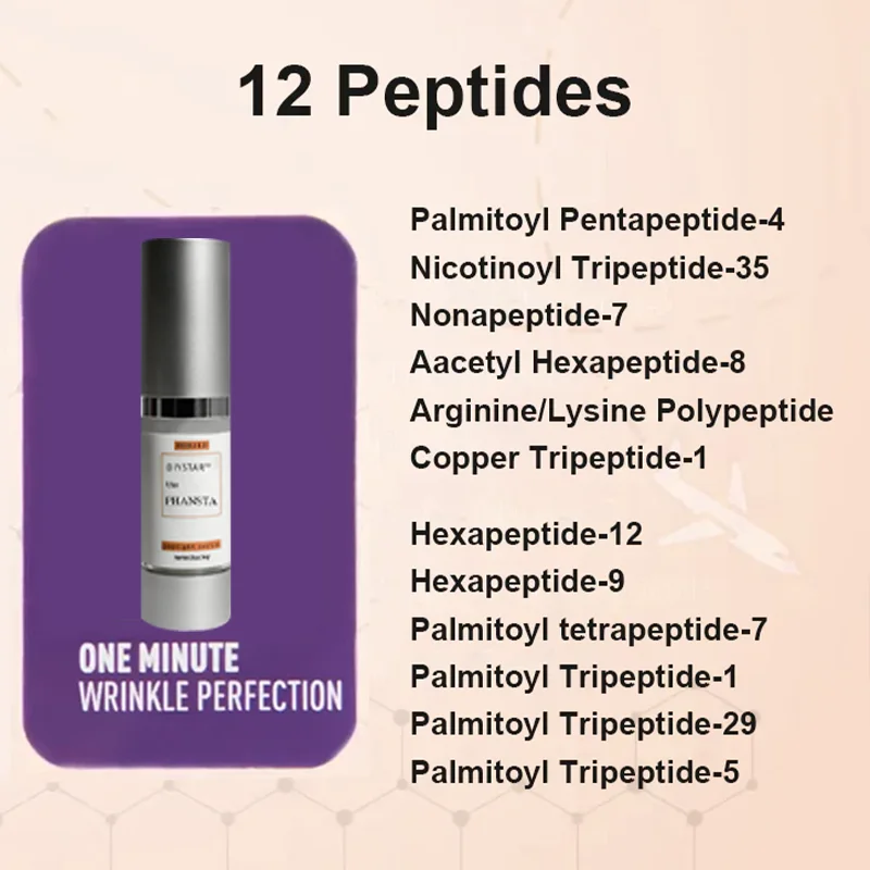 Palmitoyl Pentapeptide-4; Nicotinoyl Tripeptide-35; Nonapeptide-7; Aacetyl Hexapeptide-8; Arginine/Lysine Polypeptide; Copper Tripeptide.1. Hexapeptide-12; Hexapeptide-9; Palmitoyi tetrapeptide-7; Palmitoyl Tripeptide.1; Palmitoyl Tripeptide-29; Palmitoyl Tripeptide-5; Niacinamide; Hyaluronic acid. Glycerin; Pomegranate Extract; Resveratrol; Retinol.