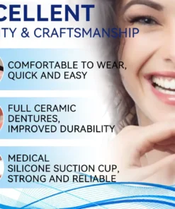 🌟 Easy fit, seamless comfort: Enjoy dentures that fit your mouth perfectly from the moment you put them on. Our state-of-the-art design ensures a snug and secure fit and provides exceptional comfort that feels like a natural part of your mouth. You can go about your day with confidence, without discomfort or slippage. You can eat, speak and smile without worry.
