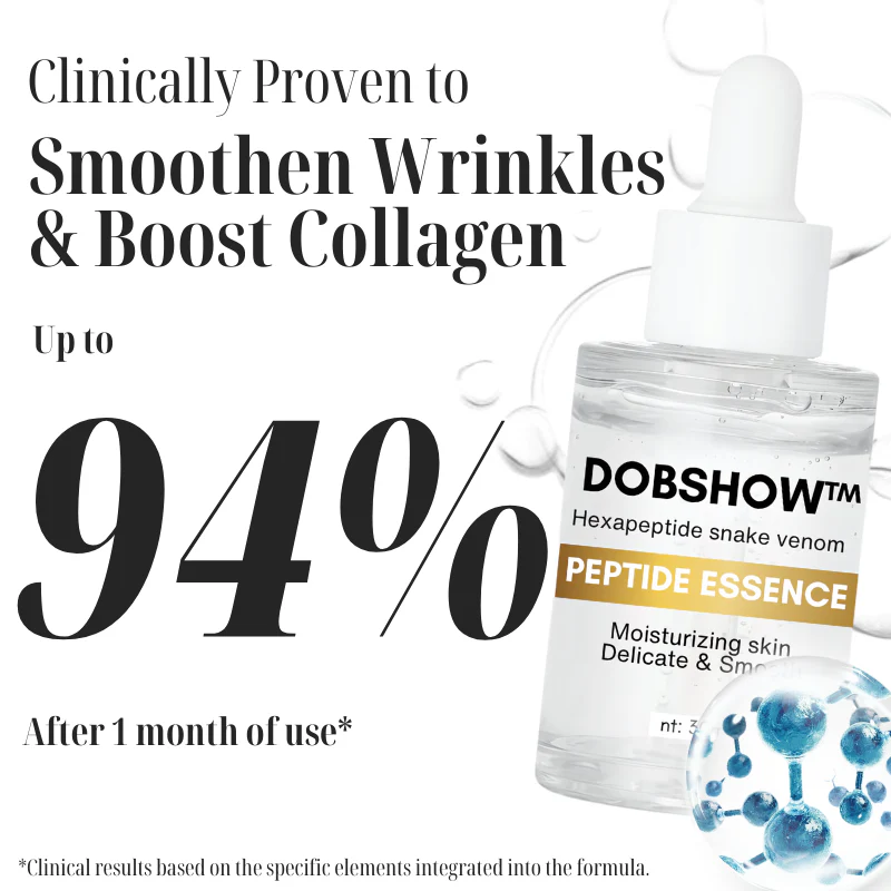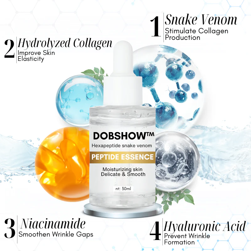 Dobshow™ Hexapeptide Snake Venom Peptide Essence harnesses the power of snake venom, a groundbreaking ingredient in the world of skincare. Clinically studied and proven to reverse the signs of aging, snake venom is known for its potent bioactive compounds that work in harmony with the skin’s natural processes to deliver remarkable anti-aging benefits.