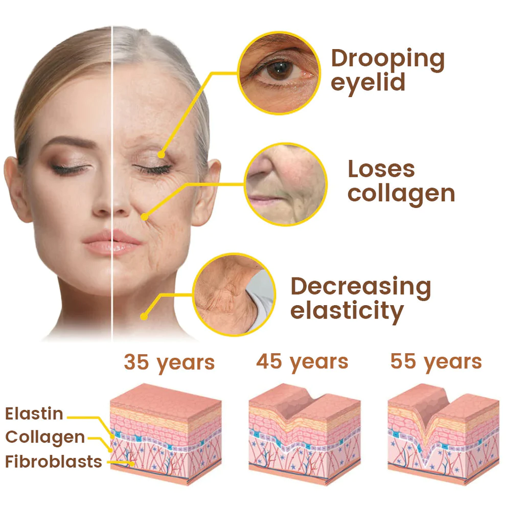 As we age, the skin gradually loses collagen and elastin, proteins that are responsible for maintaining the elasticity and firmness of the skin . Additionally, the production of these proteins decreases over time. The loss of collagen and elastin leads to a loss of skin structure and support, resulting in sagging skin and the appearance of wrinkles .