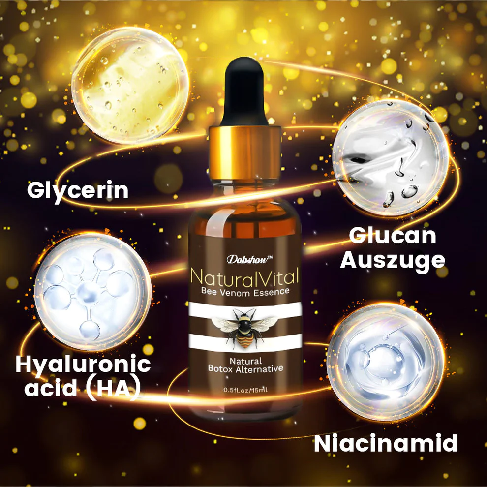 NaturalVital is proud to introduce you to our Bee Venom Essence, a product crafted with extreme care and precision to harness the incredible potential of this newfound skincare superstar. Bee venom has rapidly gained popularity because of its remarkable benefits . It has been proven to plump and tighten skin, effectively reducing the appearance of fine lines and wrinkles . But that’s not all: bee venom can prevent skin aging and ensure flawless skin by improving blood circulation.