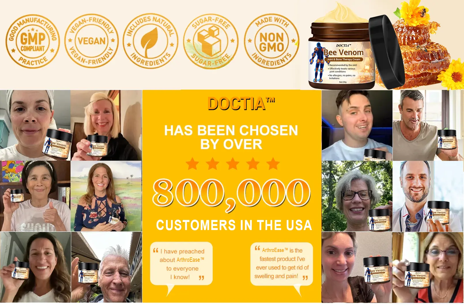 DOCTIA™ Bee Venom Instant Ultra Strength Pain Relief Therapy Cream contains six proven, powerful ingredients that have been used to effectively treat arthritis and bone-related conditions in millions of people around the world.