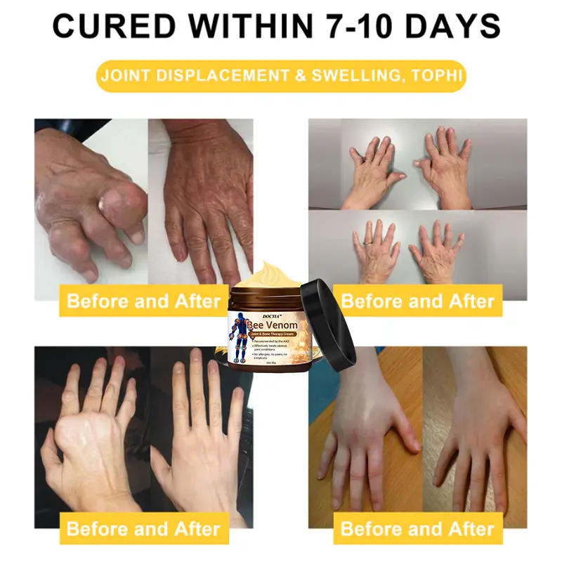 “I suffer from advanced gout in my feet, which caused severe swelling and unbearable pain in my toes. The stiffness made it difficult to walk, and I even considered surgery, but the high cost led me to look for other treatment options. I consulted my orthopedic surgeon, who recommended this DOCTIA™ Bee Venom Instant Ultra Strength Pain Relief Therapy Cream. After using it for a week, the swelling in my joints started to go down, and my toes became more flexible. After two months of continued use, my feet recovered, which is fantastic! I’ll keep buying it to make sure the gout doesn’t return!” – John Smith, 2950 Middleville Road, Los Angeles, USA.