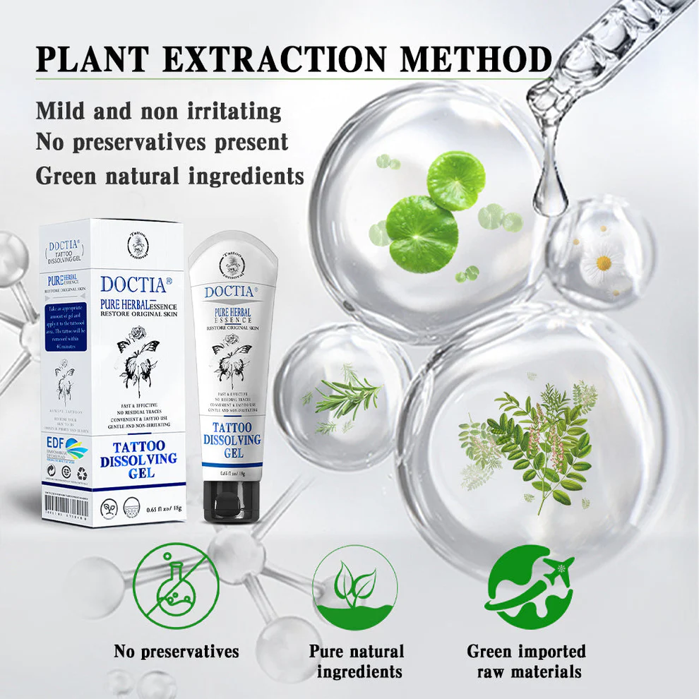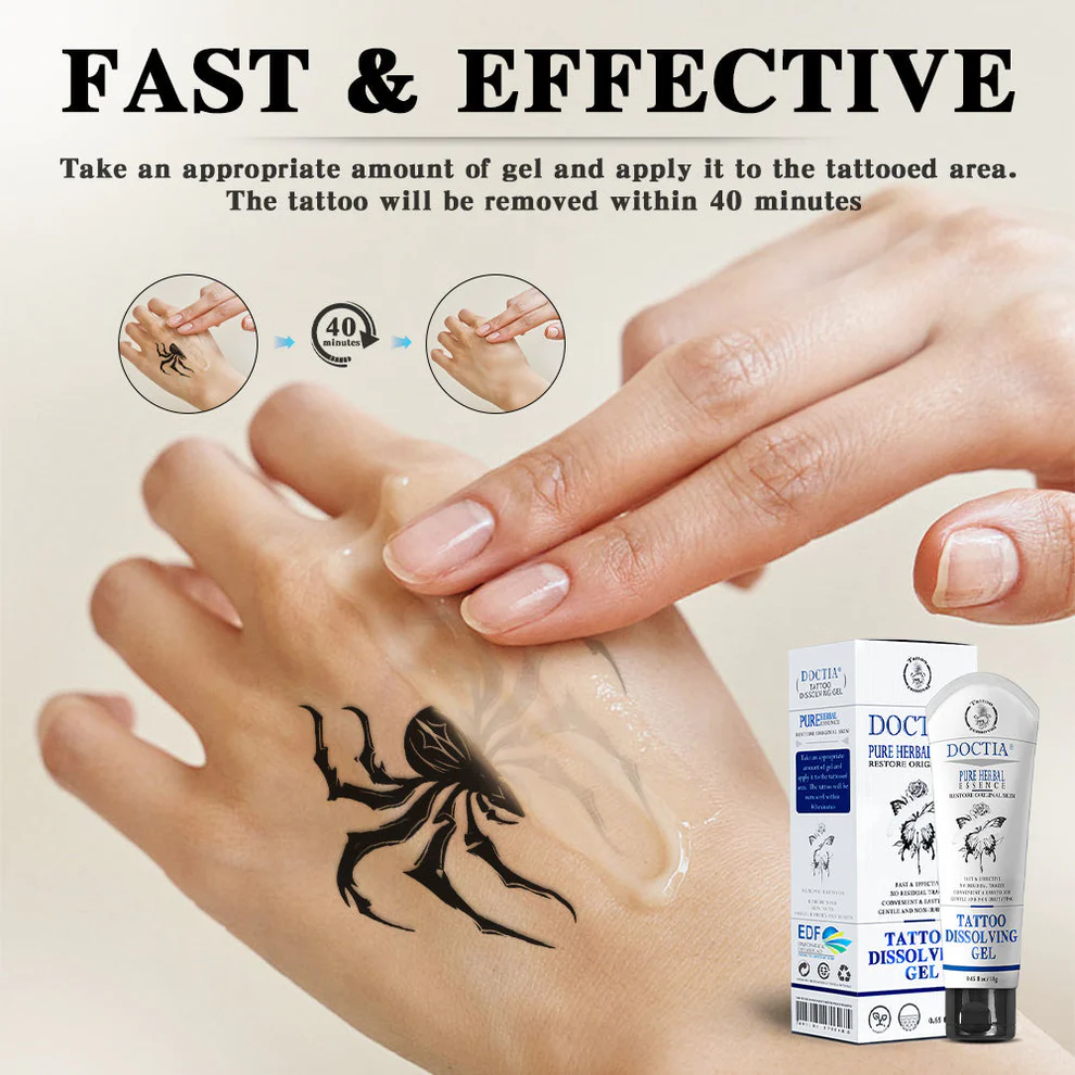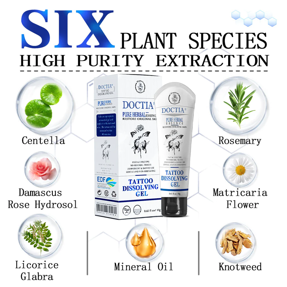 Safety: Compared with other tattoo removal methods, Doctia™ Tattoo Removal Cream is supplemented by a natural plant-based mild formula that will not cause any skin irritation or damage. Promotes rapid surface cell renewal in the skin, dissolves and removes residual artificial pigments and hydrates through the skin barrier to stimulate the natural regeneration of skin hyaluronic acid and natural moisturizing factors, keeping your skin fundamentally healthy and youthful.
