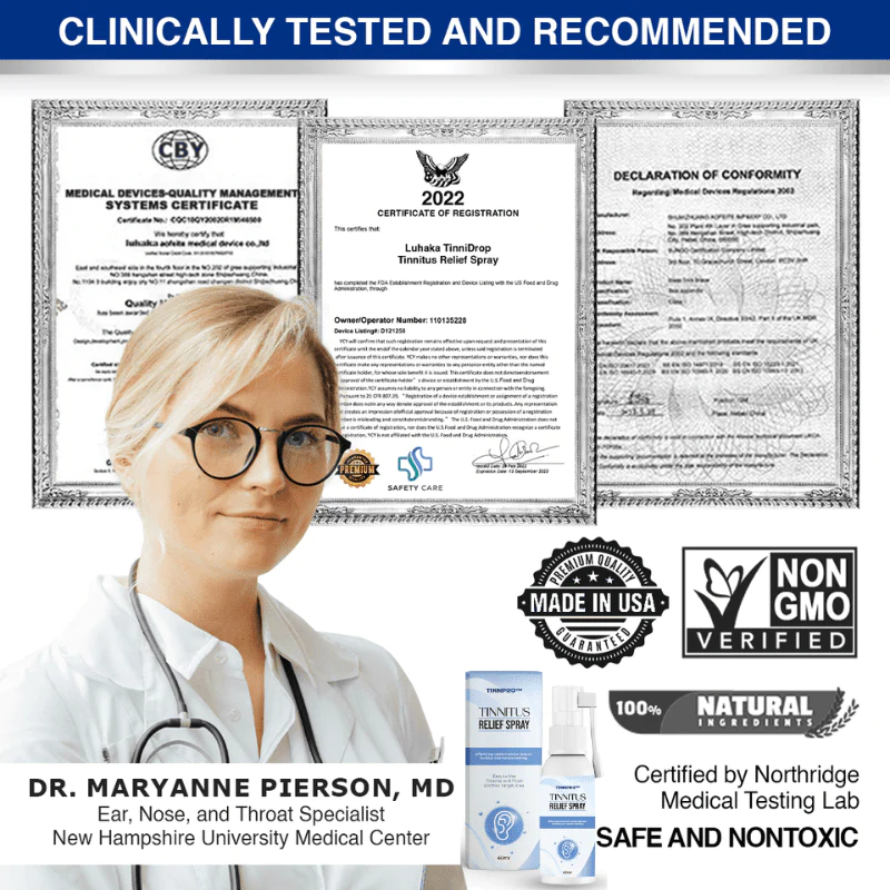 Dr. Maryanne Pierson, M.D., an otolaryngologist at New Hampshire University Medical Center in Massachusetts, and numerous other ENTs have regarded EarPure™️ Tinnitus Relief Spray as a breakthrough solution for individuals whose tinnitus persists as a chronic hindrance. While some people may experience a reduction or relief of symptoms over time, others find that tinnitus continues to significantly impact their daily lives. EarPure™️ is considered a highly effective over-the-counter remedy, providing relief from tinnitus and its associated symptoms.
