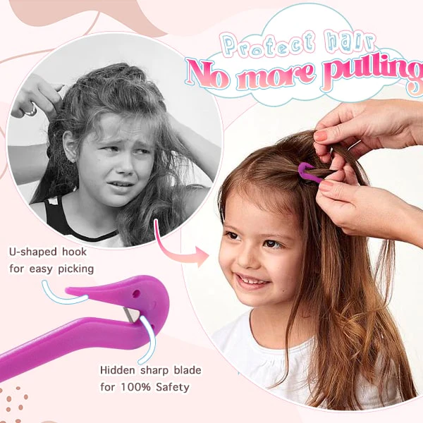 Quick and Painless Removal A handy hair accessory designed with a rounded hooking tip and sharp stainless steel blade. Allowing it to painlessly slide to your tresses and gently pick under the band loop to cut and remove with great ease and speed. Saving you from the infuriating, painful tugging that only pulls and breaks your hair stands more. No worries as this hair removal cutter does not require any special tools or skills. All you have to do is to hook, tug, cut, and remove!Ideal for everyone who ties hair, especially for those mothers and fathers who always had their daughters in fun hairstyles.