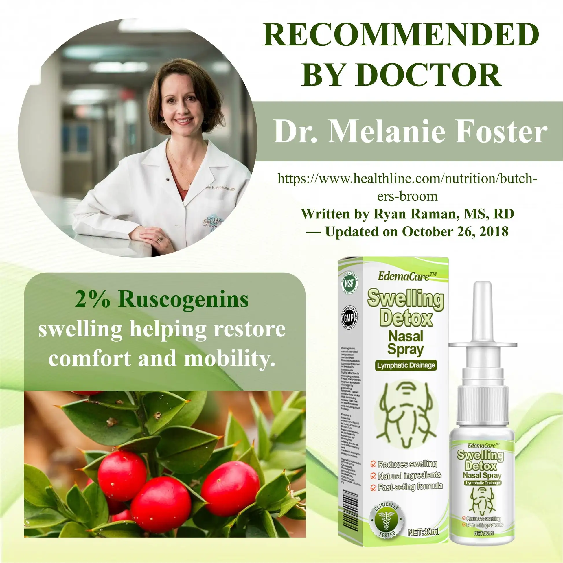 Certified by Dr. Melanie Foster, M.D., of the Medical Research Institute, April 13, 2024, EdemaCare™ SwellingDetox Nasal Spray offers a promising solution for individuals experiencing edema and related conditions. This formulation contains 2% Ruscogenins derived from Ruscus aculeatus, a key ingredient known for its anti-inflammatory properties.