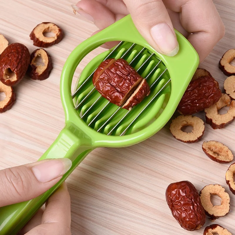 Usually, hard-boiled eggs, mushrooms, or strawberries can be difficult to cut evenly into slices, for that reason an egg slicer consists of a slotted dish for holding the egg and a hinged plate of wires or blades that can be closed to slice.