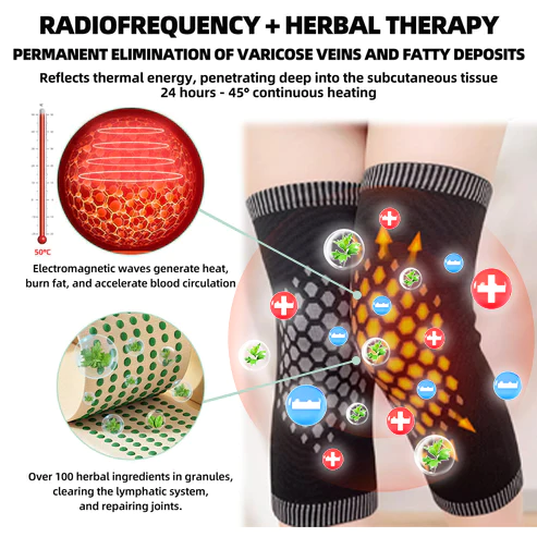 Radiofrequency Herbal Thermal Knee Support generates heat without the need for external power sources, such as electricity. This knee support combines radiofrequency therapy, compression therapy, and herbal therapy to provide thermal treatment and stimulation. It stimulates blood and lymphatic circulation, treats varicose veins, reduces lymphatic edema, and aids in knee joint recovery.