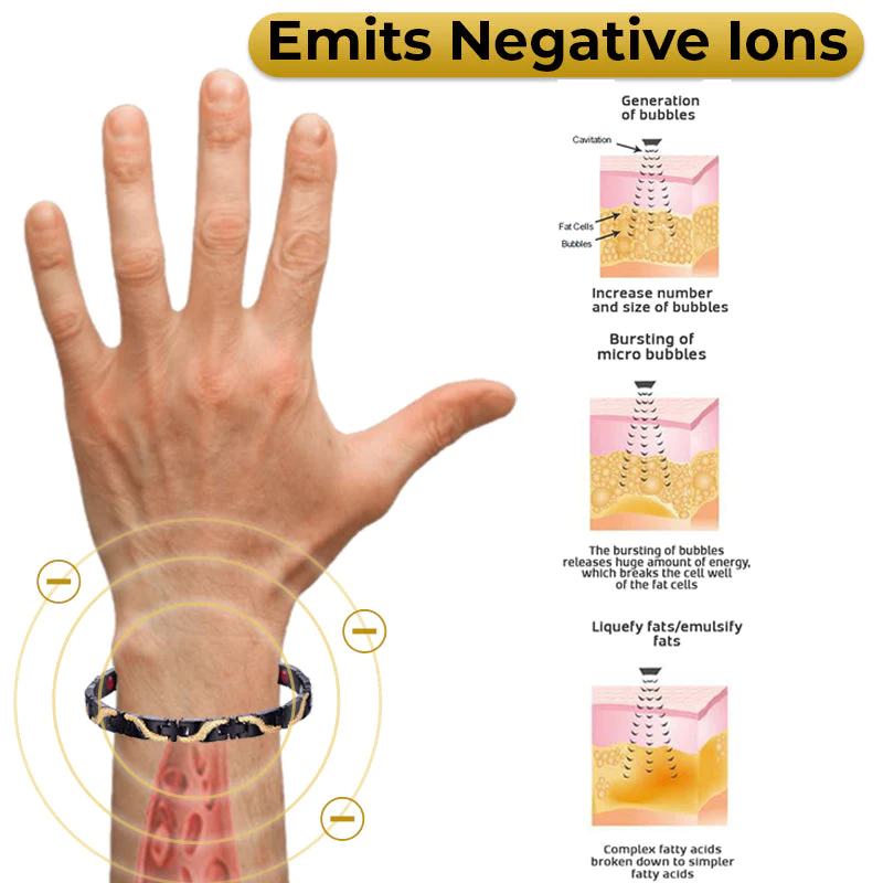 The TitanPro Lymphatic Relief Wristband helps to liquefy and break down fat cells so they may be burned quickly and easily by the body for energy. Certain fat cells in the area of fat accumulation can be destroyed by negative ions by penetrating the skin. The negative ions break down and liquefy the fat cells.