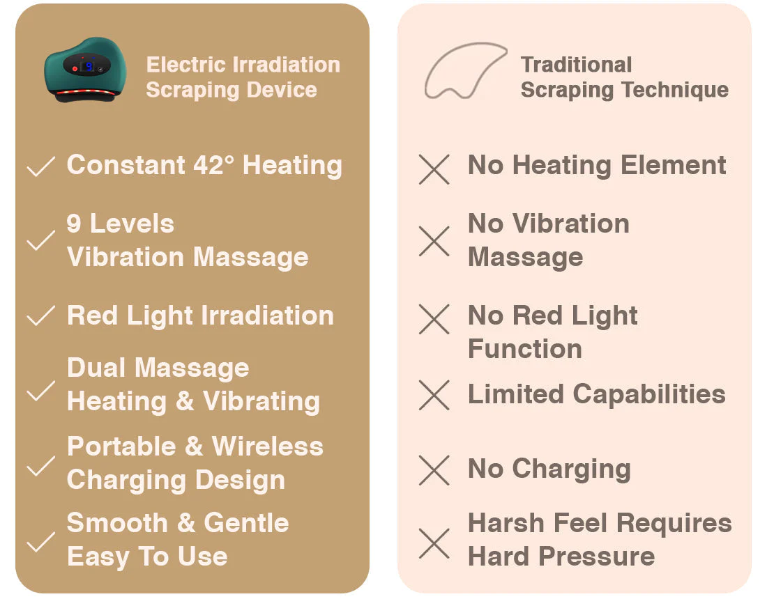Our device uses both Red Light Irradiation and Vibration Massage to enhance the effects of traditional Gua sha scraping. It helps the body more effectively drain out toxins and wastes from our systems. Scraping allows the body to get rid of harmful toxins, chemicals, heavy metals, and free radicals.