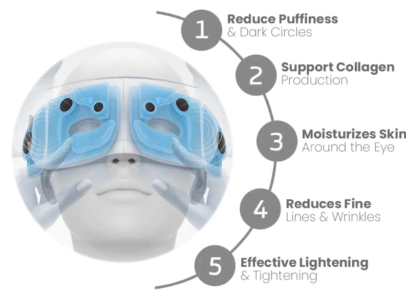 Uses safe air compression. Adopts kneading, trigger point therapy, and rhythmic percussion massaging to give you the gentle touch your eyes need. When applied on special acupuncture points, it can activate the function of the cell, enlarge the blood capillary and raise the level of oxygen supply, improve the nutrition state of tissue of cells, and balance the self-disciplined nerves. Thus, help get rid of dark circles, puffiness and saggy skin in the eye area.