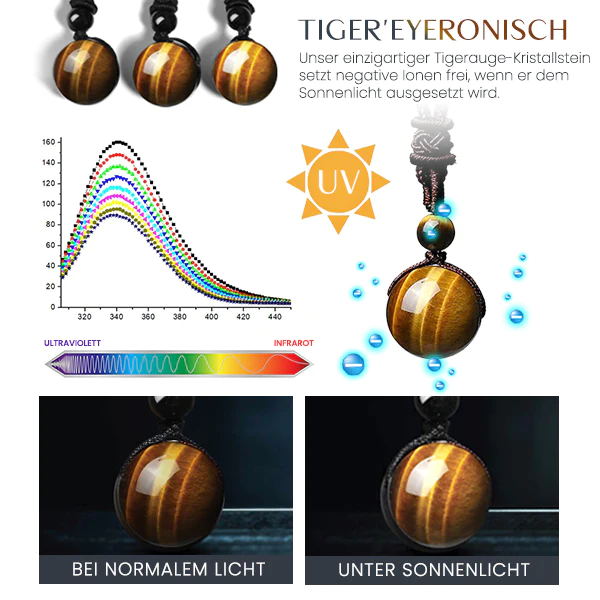 Das Herzstück dieser Halskette ist der natürliche Tigerauge-Kristall, der schon seit Jahrhunderten für seine heilenden Eigenschaften verehrt wird. Wenn der Kristallanhänger dem Sonnenlicht ausgesetzt wird, gibt das Tigerauge negative Ionen an die Umgebung ab, die nachweislich das Immunsystem unseres Körpers stärken.