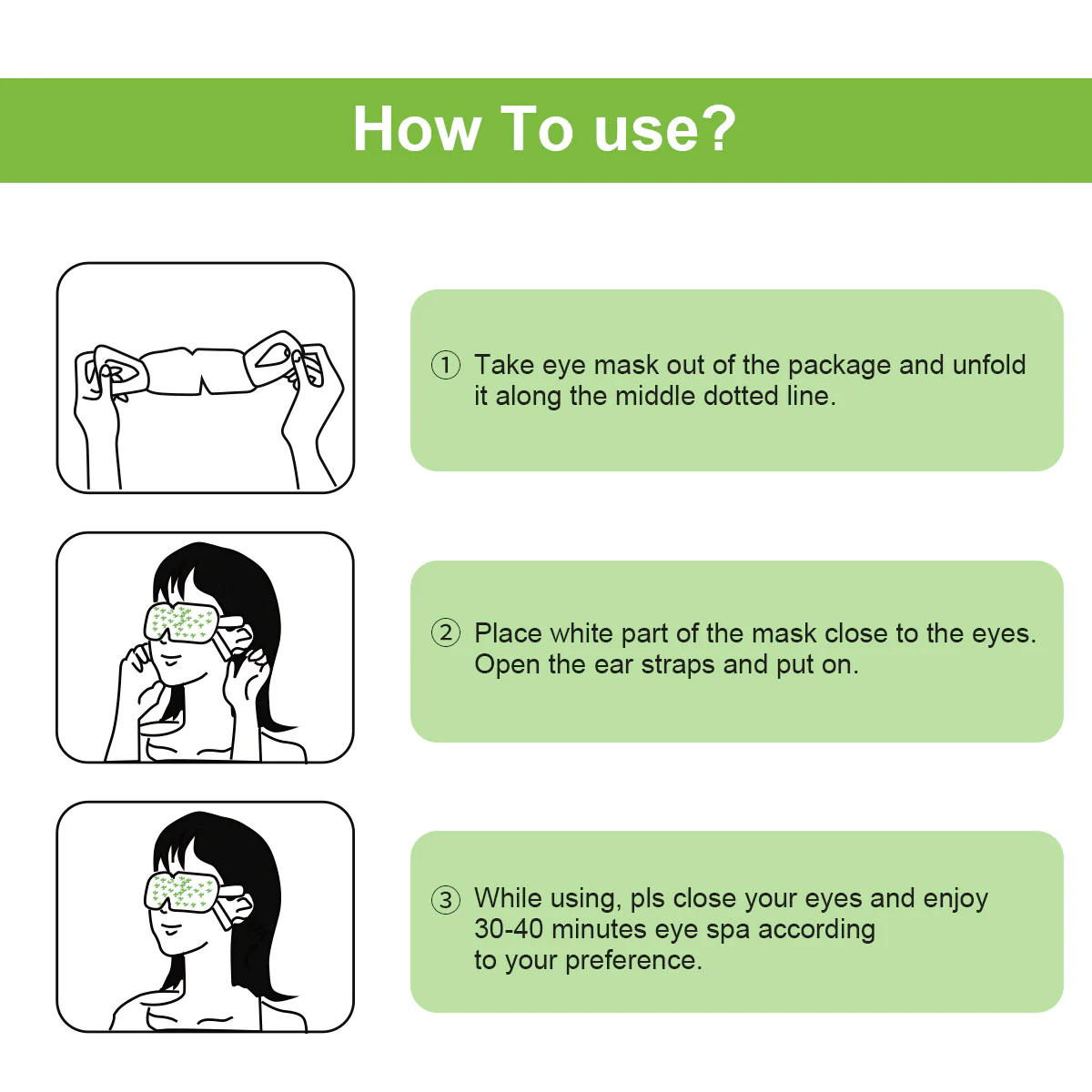 A steam eye mask is a heated eye mask, usually made of disposable materials, that contains ingredients such as herbal extracts or essential oils. When in use, open the eye mask to automatically heat and apply it to the eyes, let the steam and herbal essence penetrate into the skin around the eyes and the eyes, relieve fatigue, relieve eye dryness, and promote blood circulation.
